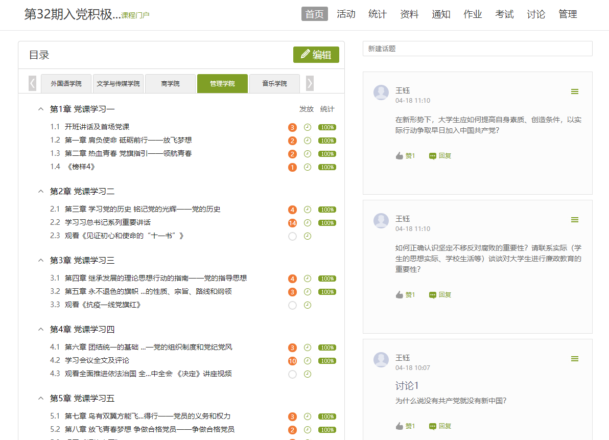 丰富培训内容,增强教育培训实效性。学校党校对培训课程进行了梳理,在稳定必修课程内容的基础上,丰富了选修课程内容,建成了一批精品课程的培训资源库,进一步完善了培训课程体系。在课程设置中强化了党的十九届四中全会精神、“不忘初心、牢记使命”主题教育等学习内容,并重点增加坚决打赢疫情防控阻击战等学习专题,用党的创新理论武装学员头脑。在课程形式方面,除了视频讲座、PPT课件、延伸阅读外,还增加了微党课、动画党课、线上讨论、心得体会等,增强培训课程吸引力。培训期间,学校党校和各分党校还将加强对学员在线学习的过程管理,确保每位学员都能高标准、高质量完成培训任务,提高入党教育培训实效。在为期一周的集中培训中,全体学员通过“学习通”进行了《学习党的历史 铭记党的光辉——党的历史》《党的指导思想》《党的组织制度和党纪党风》《新时期共产党员的党性修养》《党风廉政建设专题党课》等党课的学习,学习领会了习近平总书记在庆祝中华人民共和国成立70周年大会上的讲话、习近平总书记在主题教育工作会议上的重要讲话、习近平总书记在主题教育总结大会上的重要讲话、习近平总书记在统筹推进新冠肺炎疫情防控和经济社会发展工作部署会议上的讲话等系列重要讲话精神,学习了《中国共产党章程》《中国共产党纪律处分条例》《关于新形势下党内政治生活的若干准则》《中国共产党发展党员工作细则》等党章党规,观看了《榜样4》《见证初心和使命的“十一书”》《抗疫一线党旗红》等视频材料,并就有关专题进行了讨论交流。4月25日下午进行了统一结业考试。