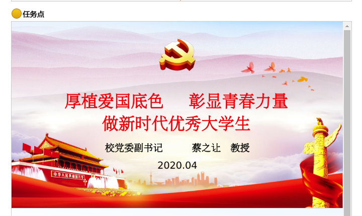 线上开班典礼,激励学员学习培训积极性。4月18日上午,第32期入党积极分子培训班“线上开班”。校党委副书记蔡之让在线上开班动员讲话中对参加本期培训的全体学员表示欢迎,并提出了具体要求。他指出,这是一次在特殊时期举办的特殊的入党积极分子培训班,各位学员一要自觉加强线上学习,努力提高党性修养和辨识能力,确保培训学习取得实实在在的效果;二要身体力行,带头倡导践行健康文明生活方式;三要以身作则,模范遵守疫情防控各项规定。蔡之让为全体学员作题为《厚植爱国底色 彰显青春力量 做新时代合格共产党员》的首场专题党课。从“爱国情怀就是不断奋斗;爱国情怀就是担当使命;厚植爱国底色,彰显青春力量,做新时代合格共产党员”三个方面,阐释了什么是爱国情怀,强调青年要把爱国之情转化为报国行动,不畏艰难、勇担使命,在实践中诠释爱国情怀,在奋斗中践行报国志向,担负起时代赋予的历史使命,在实现中华民族伟大复兴的中国梦的征途中书写人生华章。