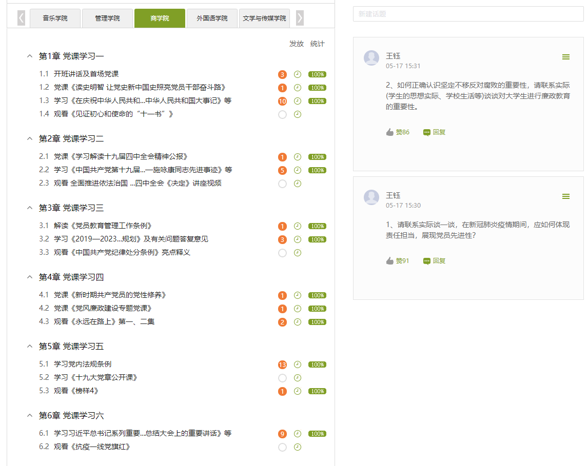 授课形式多样,达到了预期效果。由于疫情原因,此次培训班全部采用线上网络形式进行,由视频讲座、PPT课件、动画党课、线上研讨、撰写心得体会等。本次培训以《学习通》为平台,通过学习领会习近平总书记系列重要讲话、党章党规党纪、相关视频资料,开展6场党课、2次主题研讨等方式进行,授课纪律严格,从学校党校和各分党校两个层次加强线上管理,达到了预期的培训效果。