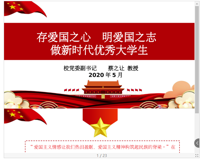 线上开班式,首场“云”党课。5月16日上午,2020年上半年党员发展对象培训班如期“线上开班”。校党委副书记蔡之让在线上开班动员讲话中对参加本期培训的全体学员表示欢迎,并提出了具体要求。他指出,2020年是纪念五四运动101周年,也是决战决胜脱贫攻坚、全面建成小康社会的收官之年,也是不寻常的一年。此次在特殊时期举办的党员发展对象培训班,各位学员一要自觉加强线上学习,努力提高政治理论水平和党性修养;二要弘扬健康新理念,倡导践行健康文明生活方式;三要知行合一,带头服从各项疫情防控规定蔡之让为全体学员作了《存爱国之心 明爱国之志 做新时代合格共产党员》首场专题“云”党课。从“存爱国之心就是要担当使命;明爱国之志就是要践行初心;存爱国之心,明爱国之志,做新时代合格共产党员。”三个方面,阐释了爱国情怀的本质,强调新时代青年要彰显青春的力量、有效履行使命,要敢于担当敢于奉献,在实践中诠释爱国情怀,在奋斗中践行报国志向,为实现中华民族伟大复兴的中国梦贡献力量。