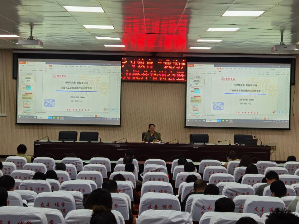 为充分发挥党支部战斗堡垒作用,切实提高党支部书记为师生办实事能力和水平,陈啸吟以《当好领头雁 种好责任田 打造有品质有温度的活力党支部》为主题作了专题辅导报告。结合《中国共产党普通高等学校基层组织工作条例》《中国共产党支部工作条例(试行)》《中国共产党党员教育管理工作条例》《新时代高校党建“双创”工作重点任务指南》等党支部工作的基本遵循,对党支部的地位作用和党支部书记的职责任务进行了讲解,对不断增强本领树好形象,抓好党支部工作,提高新时代党支部工作质量做了积极的探索与思考。一要对标“七个有力”,发挥党支部战斗堡垒作用,谱好强基达标、提质升级、创先争优“三步曲”,推动“五化联动”的基层党建质量提升机制。二要当好“领头雁”,强化理论武装,严肃党内生活,抓好党史学习教育,抓基层党建舍得花时间,下功夫。三要种好“责任田”,抓基层党建坚持可持续,动真格,围绕“整改”“职责”“中心”抓基层党建。四要画好“同心圆”,抓基层党建追求讲情怀,有高度,打造有品质、有温度、有活力的基层党建。