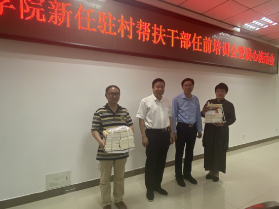 院党委书记汪刘送、院党委副书记蔡之让向第八批驻村工作队、驻村帮扶干部发放党史学习教育、乡村振兴、党内重要法规汇编等方面学习资料。第八批选派干部所在单位图书馆、后勤管理处、学报编辑部负责人分别做发言,一致表示要全力支持驻村帮扶工作。第八批选派干部武艳芹、马伟、倪清华、尹小强、段立建等逐一表态发言。