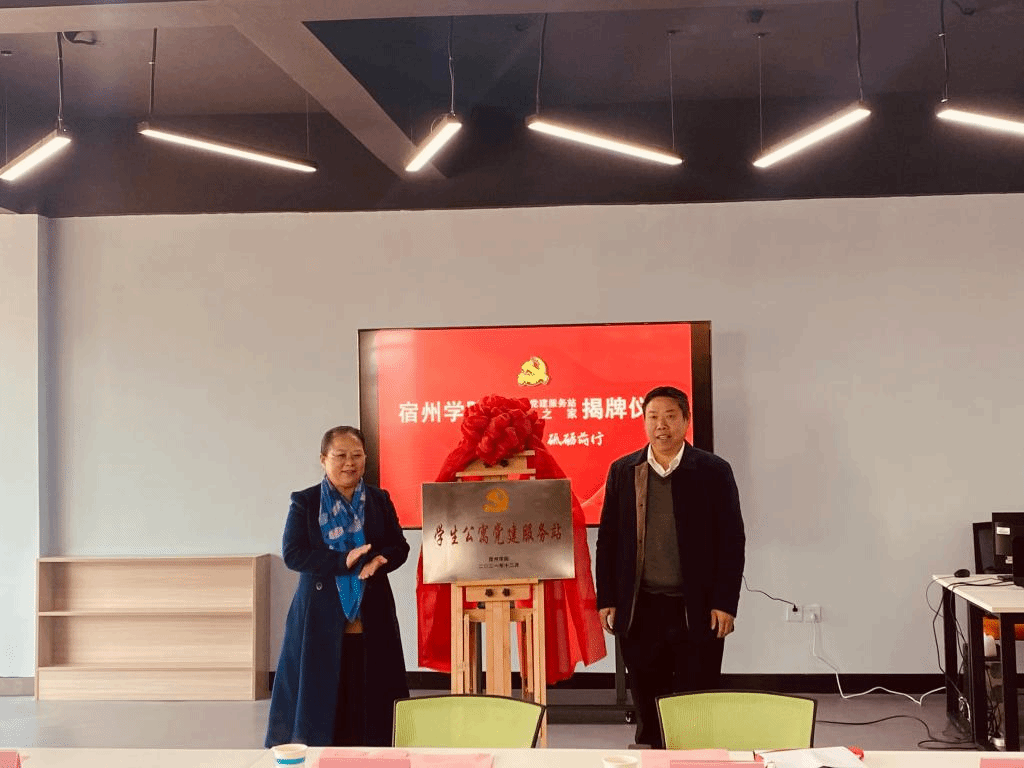 党委书记汪刘送、组织部部长陈啸吟为学生公寓党建服务站揭牌。