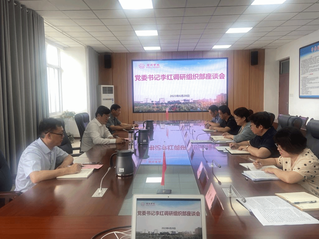 6月28日上午,校党委书记李红到组织部调研并召开座谈会。党委委员、纪委书记、监察专员王俊,纪委委员、办公室主任岳尧等陪同调研。
