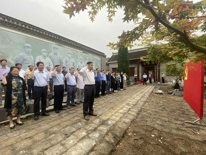 在淮海战役总前委旧址,全体党员在院党委书记汪刘送带领下重温入党誓词,面向鲜红的党旗,全体党员举起右拳庄严宣誓,表达了坚定共产主义理想信念,不忘初心、牢记使命,为党和人民的教育事业奋斗终身的信心和决心。